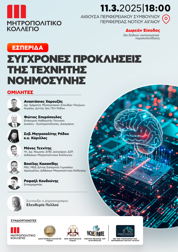 Το Μητροπολιτικό Κολλέγιο, ο Δικηγορικός Σύλλογος Ρόδου, η Ιερά Μητρόπολη Ρόδου και το Κέντρο Μελέτης του Εγκλήματος διοργανώνουν με τη στήριξη της Περιφέρειας Νοτίου Αιγαίου, την Τρίτη 11 Μαρτίου 2025 και ώρα 18:00, στη Ρόδο (Αίθουσα Συνεδριάσεων Περιφερειακού Συμβουλίου), επιστημονική εσπερίδα με θέμα: «Σύγχρονες Προκλήσεις της Τεχνητής Νοημοσύνης».