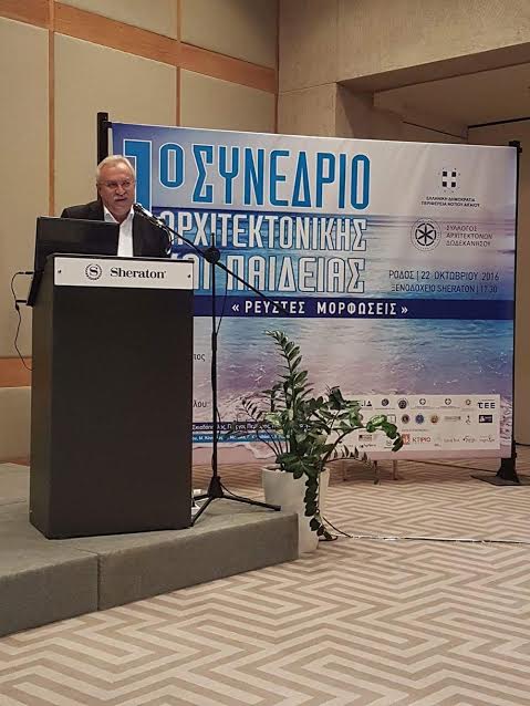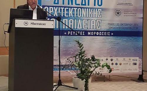 Στη σημασία της διατήρησης και της ανάδειξης της πλούσιας αρχιτεκτονικής κληρονομιάς των νησιών για τη βιώσιμη τουριστική ανάπτυξη της Δωδεκανήσου, επικέντρωσε την ομιλία του στο «1ο Συνέδριο Αρχιτεκτονικής και Παιδείας», που πραγματοποιήθηκε το Σάββατο 22 Οκτωβρίου 2016 στη Ρόδο, ο Δημήτρης Γάκης.