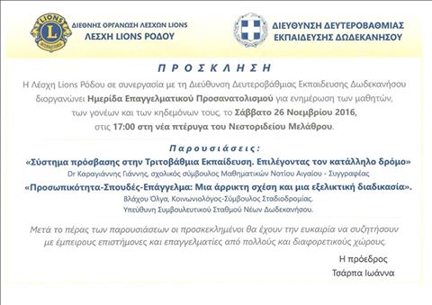 Γνωρίζοντας τις ιδιαίτερες εκπαιδευτικές ανάγκες και το συνεχώς μεταβαλλόμενο περιβάλλον στην αγορά εργασίας, η Λέσχη Lions Ρόδου σε συνεργασία με τη Διεύθυνση Δευτεροβάθμιας Εκπαίδευσης Δωδεκανήσου θα πραγματοποιήσει το Σάββατο 26 Νοεμβρίου 2016 στις 17:00 στη νέα πτέρυγα του Νεστοριδείου μελάθρου, ημερίδα για τον επαγγελματικό προσανατολισμό των μαθητών/τριών.