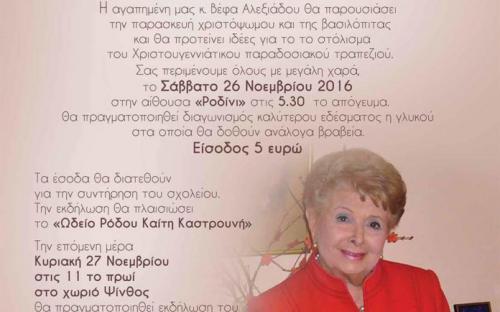 Σας περιμένουμε όλους με μεγάλη χαρά, το Σάββατο 26 Νοεμβρίου 2016 στην αίθουσα «Ροδίνι» στις 5.30 το απόγευμα.