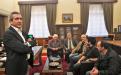 Στη συνάντηση που έγινε στο γραφείο του Περιφερειάρχη, τον νεαρό ταλαντούχο σεφ συνόδευαν ο Πρόεδρος της Λέσχης Αρχιμαγείρων Δωδεκανήσου & Κυκλάδων κ. Νίκος Χριστοφόρου, ο Γενικός Γραμματέας κ. Επαμεινώνδας Τσίντζος και ο Αναπληρωτής Γενικός Γραμματέας κ. Γιώργος Τρουμούχης, που είναι και δάσκαλος του Σταμάτη Μισομικέ, παρόντος και του Αντιπεριφερειάρχη Πρωτογενούς Τομέα κ. Φιλήμονα Ζαννετίδη.