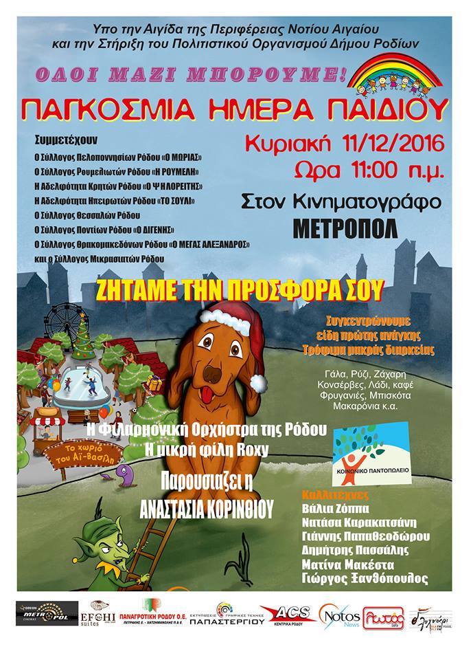 Η Φιλαρμονική Ορχήστρα του Δήμου Ροδίων θα ερμηνεύσει γνωστά μουσικά κομμάτια από ταινίες της Ντίσνεϋλαντ (disneyland ) για τους μικρούς μας φίλους . Στην παρέα μας & γνωστά μουσικά σχήματα της πόλης μας με μουσικές του κόσμου.