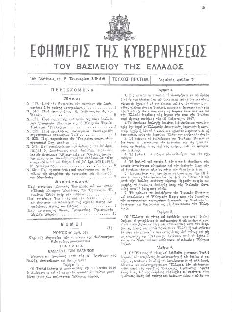 Σε τεσσερισήμιση γραμμές ολοκληρώθηκε δια του άρθρου 1 του Νόμου 518/1948 η περιπόθητη «Προσάρτηση», «Ενωση» της Δωδεκανήσου μετά της Μητρός Ελλάδος.