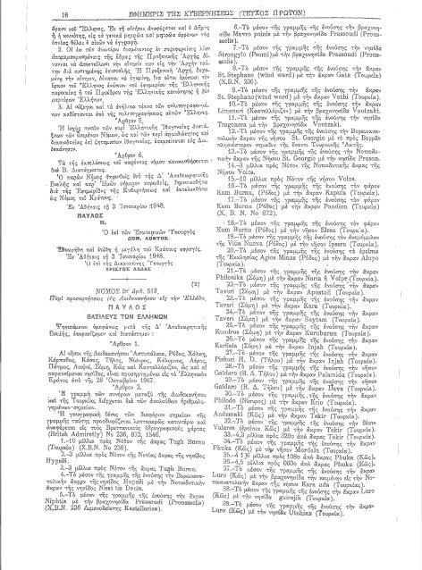 «Αι νήσοι της Δωδεκανήσου Αστυπάλαια, Ρόδος , Χάλκη, Κάρπαθος, Κάσος, Τήλος, Νίσυρος, Κάλυμνος, Λέρος, Πάτμος, Λειψοί, Σύμη, Κως και Καστελόριζον, ως και αι παρακείμεναι Νησίδες, είναι προσηρτημέναι εις το Ελληνικόν Κράτος από της 28 Οκτωβρίου 1947».
