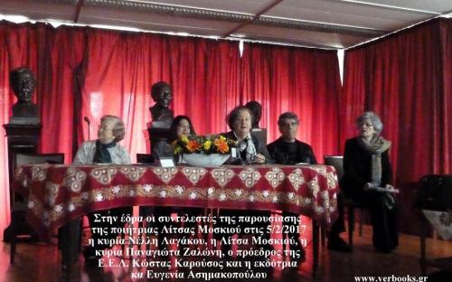της Ροδίτισσας ποιήτριας Λίτσας Μοσκιού την Κυριακή 5 Φεβρουαρίου 2017 ώρα 12:00 στην αίθουσα Μιχαήλας Αβέρωφ της Εταιρίας Ελλήνων Λογοτεχνών (Γ. Γενναδίου 8, 7ος όροφος)