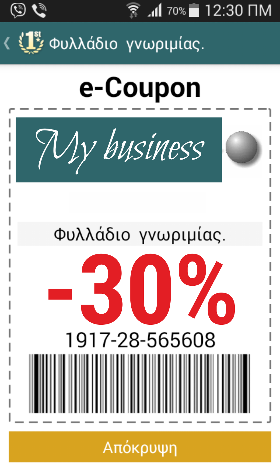 Παράλληλα δημιουργεί, για κάθε “ΠΡΟΣΦΟΡΑ-ΕΚΠΤΩΣΗ” που παρέχει η επιχειρήση, “e-coupons” ( ηλεκτρονικά κουπόνια ), στα κινητά των πελατών, που έχουν κατεβάσει την εφαρμογή.