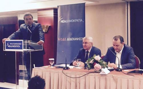 Με μεγάλη μου χαρά, νιώθοντας ιδιαίτερη τιμή, αλλά και ευθύνη, βρίσκομαι σήμερα ανάμεσά σας. Ευχαριστώ θερμά τη ΝΟΔΕ Δωδεκανήσου για την πρόσκλησή και χαίρομαι ιδιαιτέρως για την πρωτοβουλία της, σε συνεργασία με την Γραμματεία Οργανωτικού της ΝΔ, να συγκαλέσει Νομαρχιακή Συνέλευση.