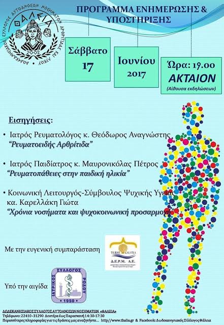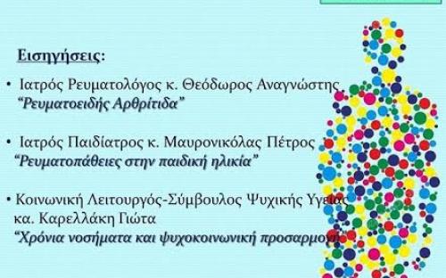 Η τελευταία παρουσίαση θα πραγματοποιηθεί το Σάββατο 17 Ιουνίου 2017, ώρα 19:00, στο ΑΚΤΑΙΟΝ (αίθουσα εκδηλώσεων), με εισηγητές, τον ιατρό Ειδικό Ρευματολόγο κ. Θοδωρή Αναγνώστη, τον ιατρό Παιδίατρο κ. Μαυρονικόλα Πέτρο και την Κοινωνική Λειτουργό-Σύμβουλο Ψυχικής Υγείας κα. Καρελλάκη Γιώτα.
