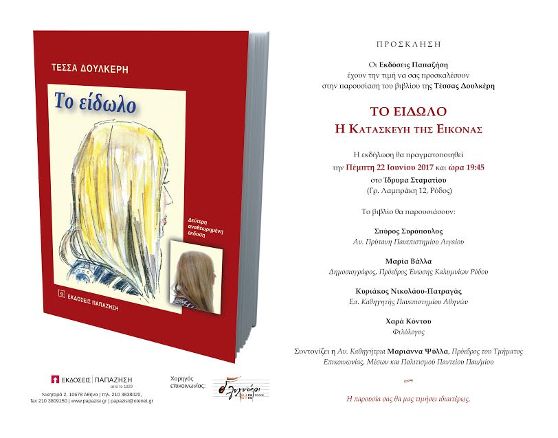 Πως κατασκευάζεται ένα είδωλο. Η διπλή ζωή, με την κατασκευασμένη εικόνα των δημοσίων προσώπων... Παρουσίαση του βιβλίου της καθηγήτρια στο τμήμα δημοσιογραφίας του Αριστοτελείου Πανεπιστημίου, Τέσσας Δουλκέρη την Πέμπτη 22 Ιουνίου στις 8.00 το βράδυ, στο Ίδρυμα Σταματίου, πλησίον Επιμελητηρίου στη Ρόδο.