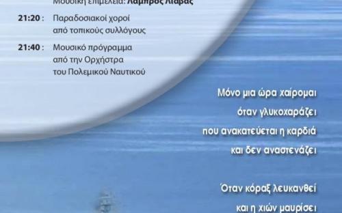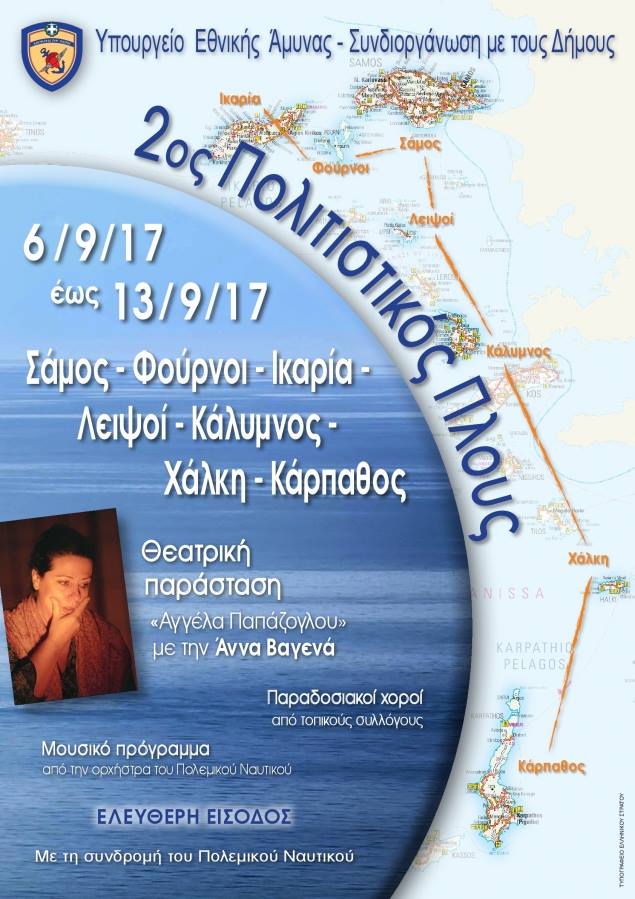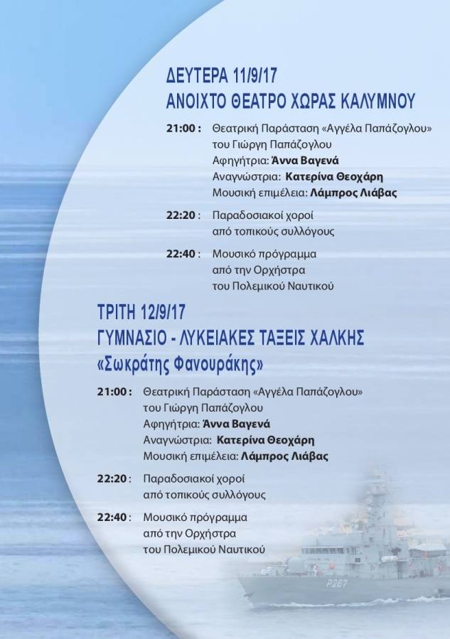 Τη Δευτέρα 11 Σεπτέμβρη 2017 ώρα 9.00 μ.μ., στο Ανοικτό Θέατρο Χώρας, η θεατρική παράσταση "Αγγέλα Παπάζογλου" με την Άννα Βαγενά και μετά παραδοσιακοί χοροί και μουσικό πρόγραμμα από την Ορχήστρα του Πολεμικού Ναυτικού.