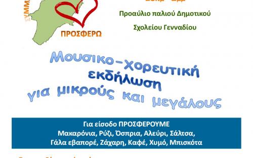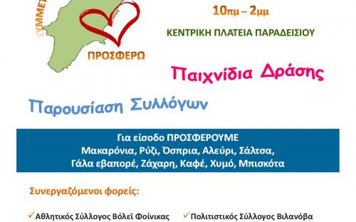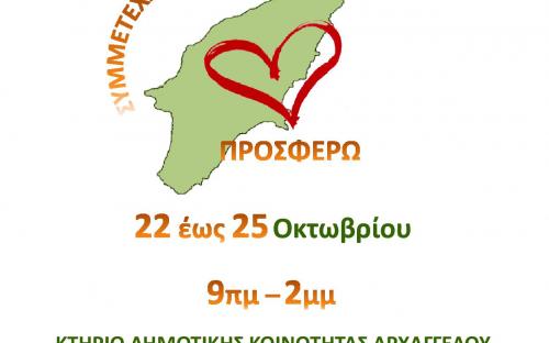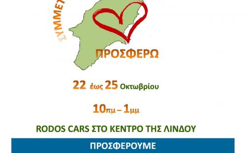 Την Κυριακή 22 Οκτωβρίου για πρώτη φορά σε 7 διαφορετικά μέρη του νησιού (Ροδίνι, Καλυθιές, Λίνδος, Αρχάγγελος, Παραδείσι, Λάερμα και Νότια Ρόδος) από τις 10 το πρωί μέχρι τις 2 το μεσημέρι διοργανώνουμε την εκδήλωση ΣΥΜΜΕΤΕΧΩ – ΔΙΑΣΚΕΔΑΖΩ – ΠΡΟΣΦΕΡΩ. Εθελοντικές οργανώσεις και εθελοντές πολίτες καταθέτουν δρώμενα για να διασκεδάσουμε όλοι μαζί και ταυτόχρονα ο καθένας μας με τις δυνάμεις του να προσφέρει. Το μοναδικό αντίτιμο για τη συμμετοχή στις εκδηλώσεις είναι η προσφορά τροφίμων μακράς διαρκείας και συγκεκριμένα Μακαρόνια, Ρύζι, Όσπρια, Αλεύρι, Ζάχαρη, Σάλτσα, Γάλα εβαπορέ, Καφές, Χυμός, Μπισκότα.