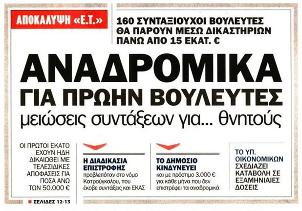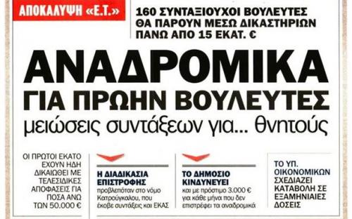 Θα πάρουν πάνω από 15 εκατ. ευρώ - Ενώ οι συντάξεις των κοινών θνητών συνεχίζουν να μειώνονται«Μποναμά» ετοιμάζεται να δώσει η κυβέρνηση στους πρώτους 100 πρώην βουλευτές, που δικαιώθηκαν δικαστικά για την εξίσωση των αποδοχών τους με αυτές του προέδρου του Αρείου Πάγου, αναδρομικά από το 2009 και μετά.