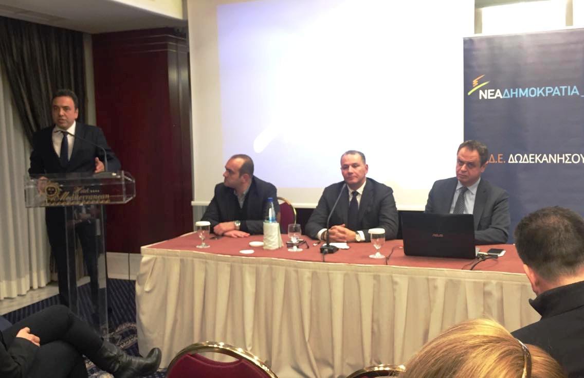 Πρόεδρε της ΝΟΔΕ ευχαριστώ για την τιμή και για την πρόσκληση. Αξιότιμε Γραμματέα Οργανωτικού της Ν.Δ., καλώς ήρθατε κοντά μας. Πρόεδρε της Περιφερειακής Οργάνωσης της Ν.Δ. στο Νότιο Αιγαίο, σας χαιρετίζω.