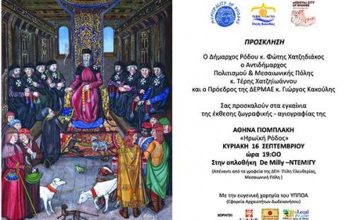 Έκθεση της ζωγράφου και αγιογράφου Αθηνάς Γιομπλάκη με θέμα «Ηρωική Ρόδος», διοργανώνει ο Δήμος Ρόδου και η ΔΕΡΜΑΕ στην οπλοθήκη De Milly (Ντεμιγύ- απέναντι από τα γραφεία της ΔΕΗ) στην Πύλη Ελευθερίας, από τις 16 Σεπτεμβρίου έως και τις 15 Οκτωβρίου.