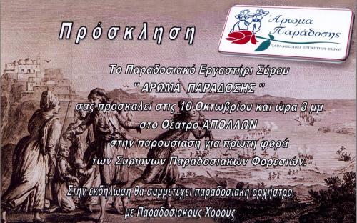 Το Παραδοσιακό Εργαστήρι Σύρου «Άρωμα Παράδοσης» σας προσκαλεί την Τετάρτη 10 Οκτωβρίου 2018 και ώρα 20:00, στο Θέατρο Απόλλων, στην παρουσίαση της Γυναικείας & της Ανδρικής Παραδοσιακής Φορεσιάς της Σύρου.