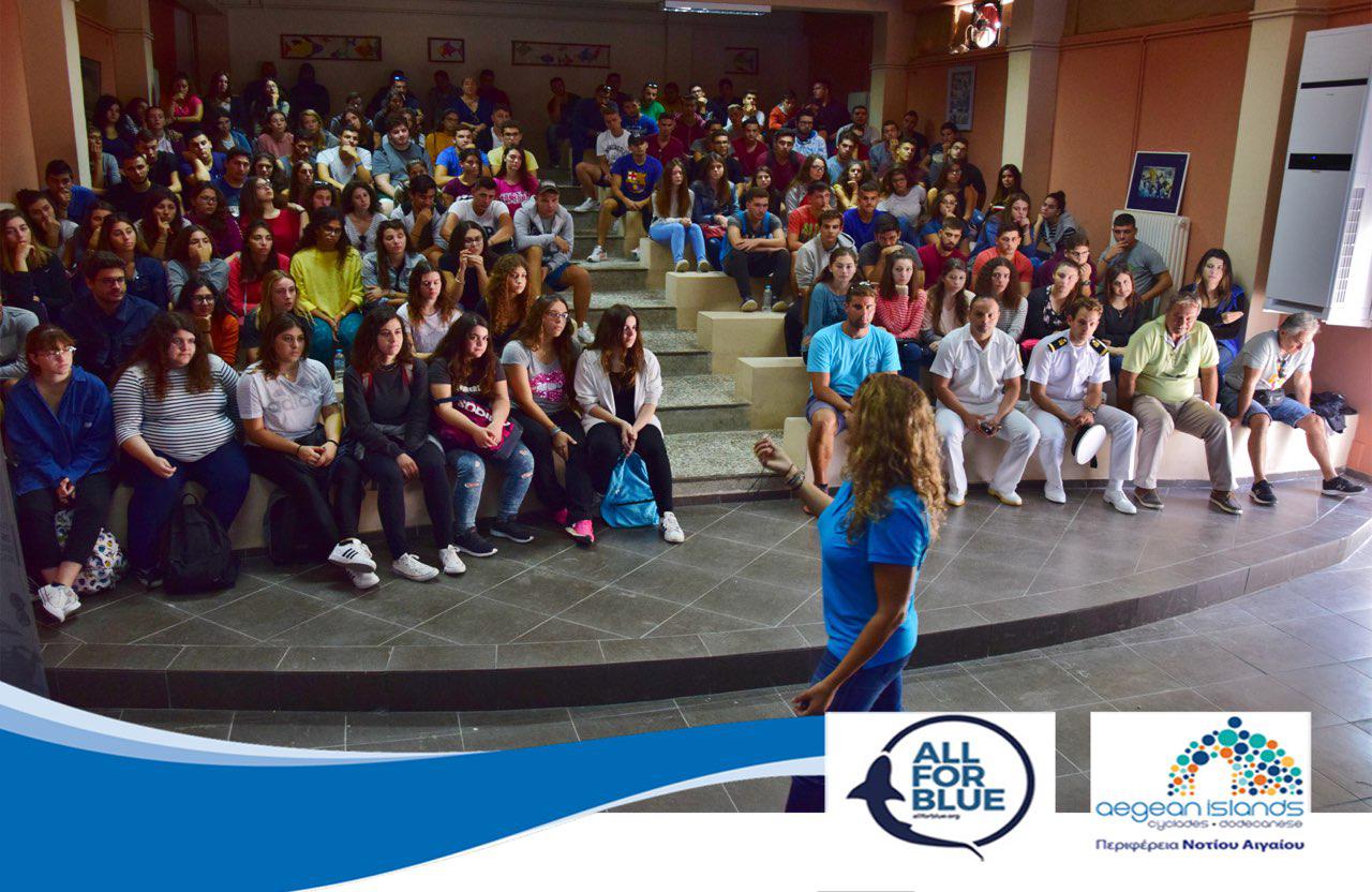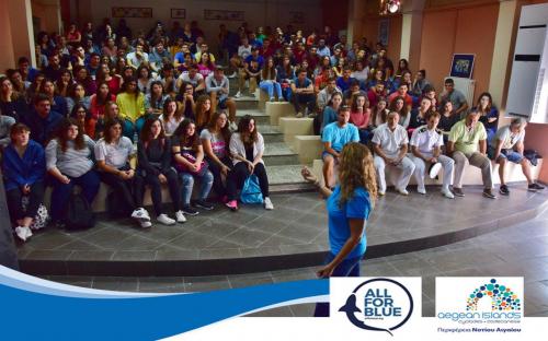 H Κατερίνα Τοπούζογλου, ενημέρωσε τους συμμετέχοντες για την δράση του Οργανισμού “All for Blue” που στόχο έχει να άρει τις προκαταλήψεις σχετικά με τους καρχαρίες και να αναδείξει την συμβολή τους στην διατήρηση και την ισορροπία του θαλάσσιου οικοσυστήματος, καθώς είναι οι κατ’ εξοχήν καθαριστές του θαλάσσιου περιβάλλοντος, γι’ αυτό και πρέπει να παλέψουμε για την προστασία τους. Κάθε χρόνο θανατώνονται 100.000.000 καρχαρίες και αυτό έχει άμεσο αντίκτυπο στο θαλάσσιο περιβάλλον. Πρόσφατα, όπως είπε, δημοσιεύτηκε έρευνα, η οποία λέει πως μέχρι το 2038 θα έχουμε στη θάλασσα περισσότερα σκουπίδια, απ’ ό,τι ψάρια. Για τον λόγο αυτό είναι σημαντικό να ξεπεραστούν οι προκαταλήψεις για τους καρχαρίες, όπως τόνισε, αν θέλουμε να σώσουμε τις θάλασσες μας.