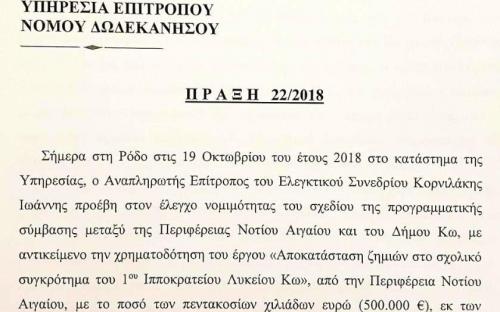Η έγκριση του Ελεγκτικού Συνεδρίου για την υπογραφή της σχετικής Προγραμματικής Σύμβασης συνεργασίας μεταξύ Περιφέρειας Ν. Αιγαίου και Δήμου Κω για την χρηματοδότηση επισκευής των σχολείων, δόθηκε από τις υπηρεσίες του Ελεγκτικού Συνεδρίου την Παρασκευή 19 Οκτωβρίου και μας απεστάλη στις 23 Οκτωβρίου 2018.