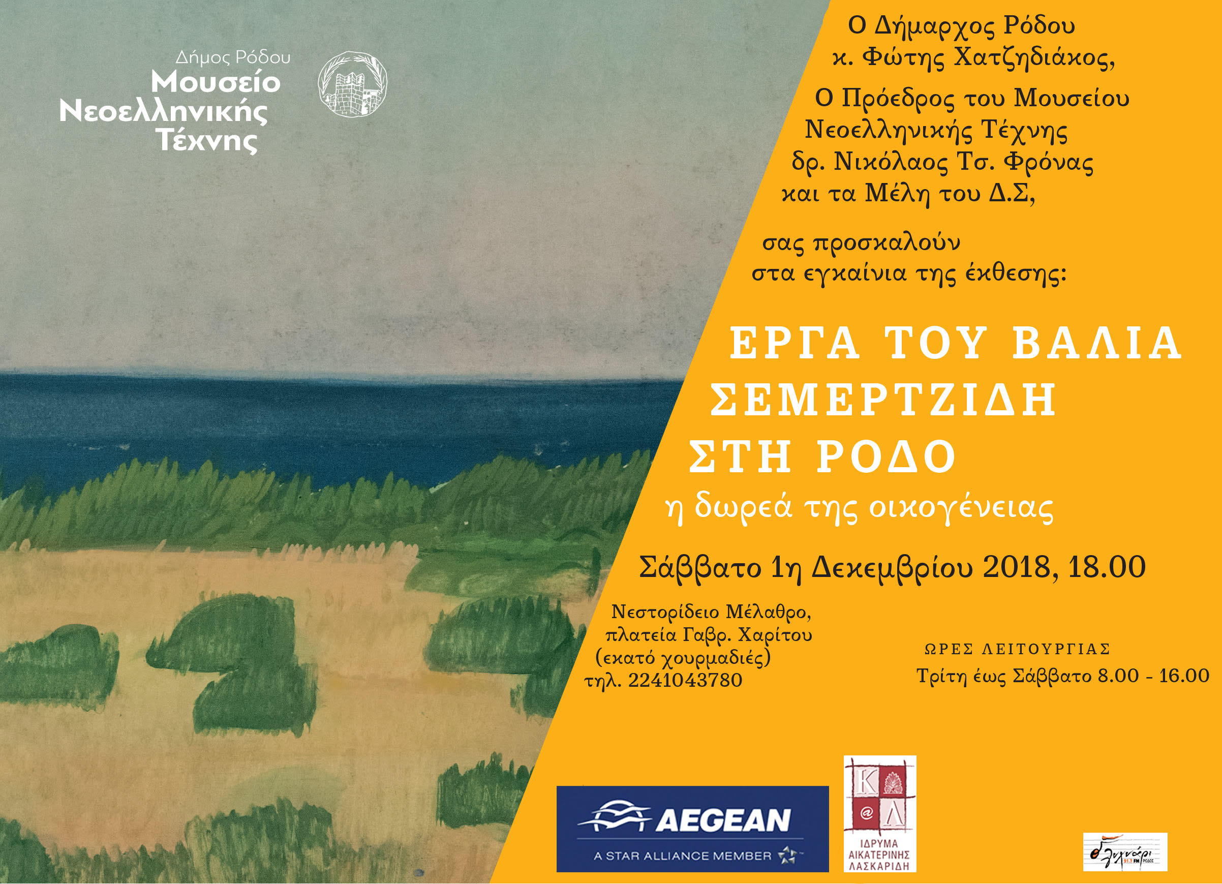 Tο Σάββατο 1 Δεκεμβρίου, το Μουσείο Νεοελληνικής Τέχνης του Δήμου Ρόδου, θα καταγράψει στο πλούσιο ημερολόγιο των πεπραγμένων της 58χρονης ιστορίας του, ένα ακόμη σημαντικό εικαστικό γεγονός. Πρόκειται για τα εγκαίνια της έκθεσης – μόνιμης συλλογής 103 έργων Ζωγραφικής, χαρακτικής, ενός  σημαντικού καλλιτέχνη του περασμένου αιώνα, του Βάλια Σεμερτζίδη.