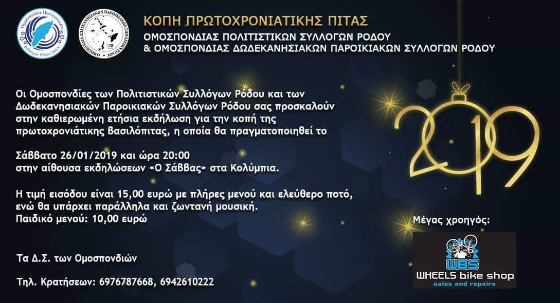 Οι Ομοσπονδίες των Πολιτιστικών Συλλόγων Ρόδου και των Δωδεκανησιακών Παροικιακών Συλλόγων Ρόδου σας προσκαλούν στην καθιερωμένη ετήσια εκδήλωση για την κοπή της πρωτοχρονιάτικης βασιλόπιτας, η οποία θα πραγματοποιηθεί το