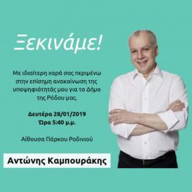 ΔΕΛΤΙΟ ΤΥΠΟΥ: Τη Δευτέρα 28 Ιανουαρίου 2019, στις 5:40 μ.μ ο Αντώνης Καμπουράκης στην Αίθουσατου Πάρκου Ροδινιού θα ανακοινώσει την υποψηφιότητα του για το Δήμο Ρόδου.