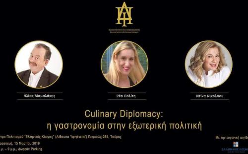 Το Ελληνικό Ινστιτούτο Πολιτιστικής Διπλωματίας υπό την αιγίδα του Ελληνικού Κόσμου διοργανώνει συζήτηση με τους chef κ. Ηλία Μαμαλάκη και κα. Ντίνα Νικολάου υπό τον τίτλο ''Culinary Diplomacy: η γαστρονομία στην εξωτερική πολιτική''.