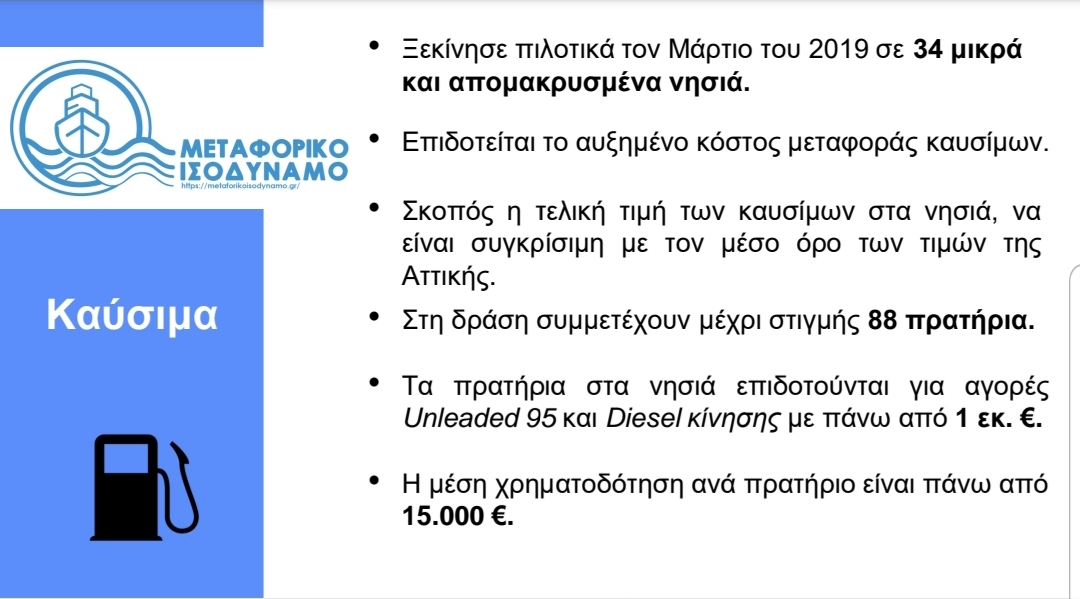 «Πιλοτικά έχει ξεκινήσει σε 34 μικρά και απομακρυσμένα νησιά και η χρηματοδότηση γίνεται με βάση την απόσταση από το διυλιστήριο, τη διαθεσιμότητα εγκαταστάσεων αποθήκευσης στο νησί και το μέγεθος της αγοράς του».
