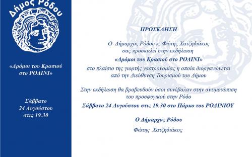 Μία ξεχωριστή εκδήλωση με τίτλο «Δρόμοι του κρασιού στο Ροδίνι» και με επίκεντρο τα μοναδικά ροδίτικα κρασιά, την τοπική μας παράδοση και την ντόπια γαστρονομία, διοργανώνει η Διεύθυνση Τουρισμού του Δήμου Ρόδου στο πλαίσιο της καθιερωμένης ετήσιας Γιορτής Γαστρονομίας, στις 7.30 το βράδυ του Σαββάτου 24 Αυγούστου 2019, στον μοναδικό χώρο του Ροδινιού.
