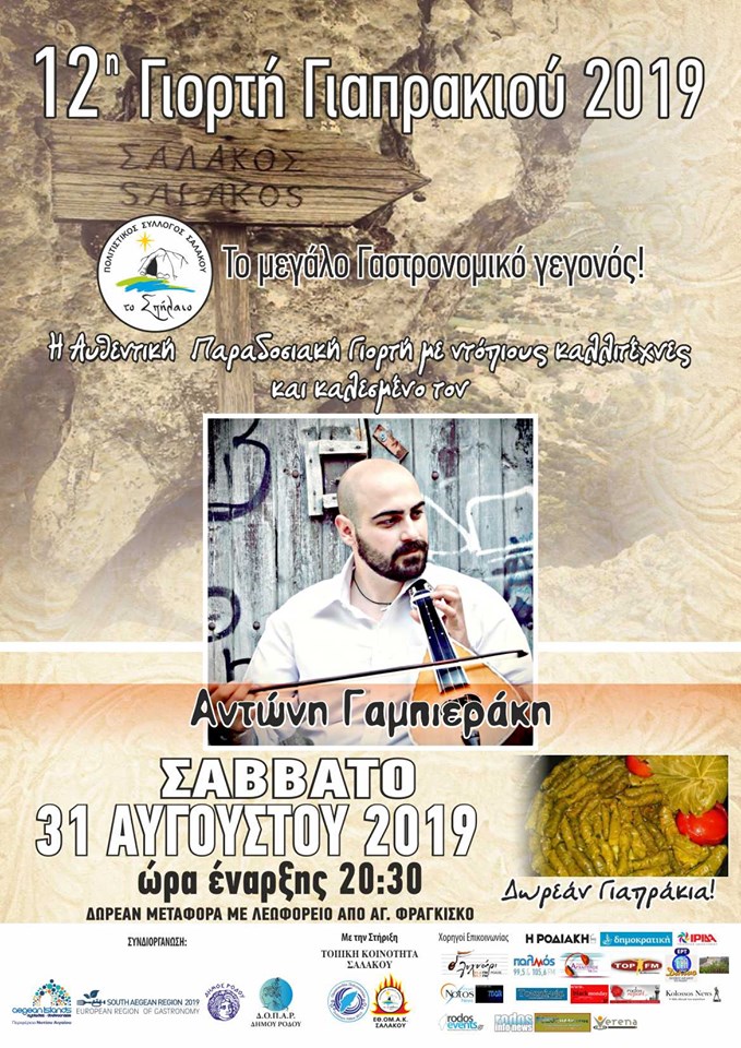 Ο Πολιτιστικός Σύλλογος Σαλάκου «Το Σπήλαιο» Σας προσκαλεί στην 12η γιορτή Γιαπρακιού στην Σάλακο, το Σάββατο 21 Αυγούστου 2019 και ώρα 20:30.