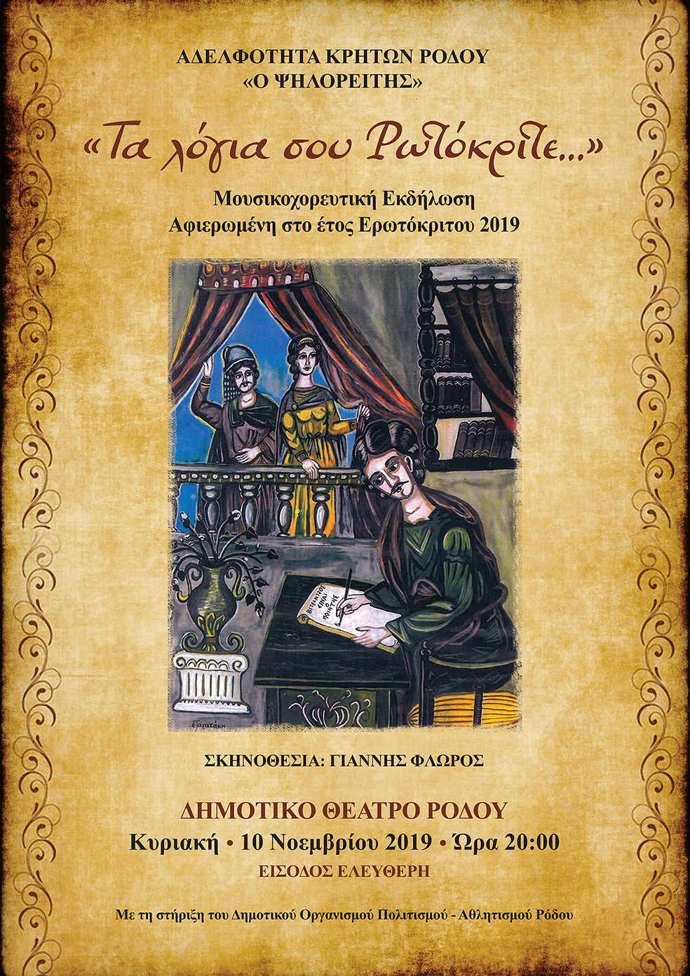 Ένα μουσικοχορευτικό αφιέρωμα στον Ερωτόκριτο, το σπουδαίο έργο της Κρητικής λογοτεχνίας με αφορμή το έτος Ερωτόκριτου 2019.