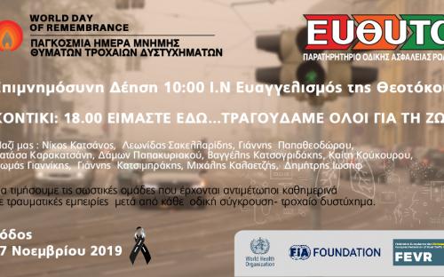 Στο πλαίσιο της Παγκόσμιας Ημέρα Μνήμης Θυμάτων Τροχαίων, η ΕΥΘΥΤΑ-ΠΑΡΑΤΗΡΗΤΗΡΙΟ ΟΔΙΚΗΣ ΑΣΦΑΛΕΙΑΣ ΡΟΔΟΥ, πραγματοποιεί τις εκδηλώσεις Κυριακή 17 Νοεμβρίου 2019