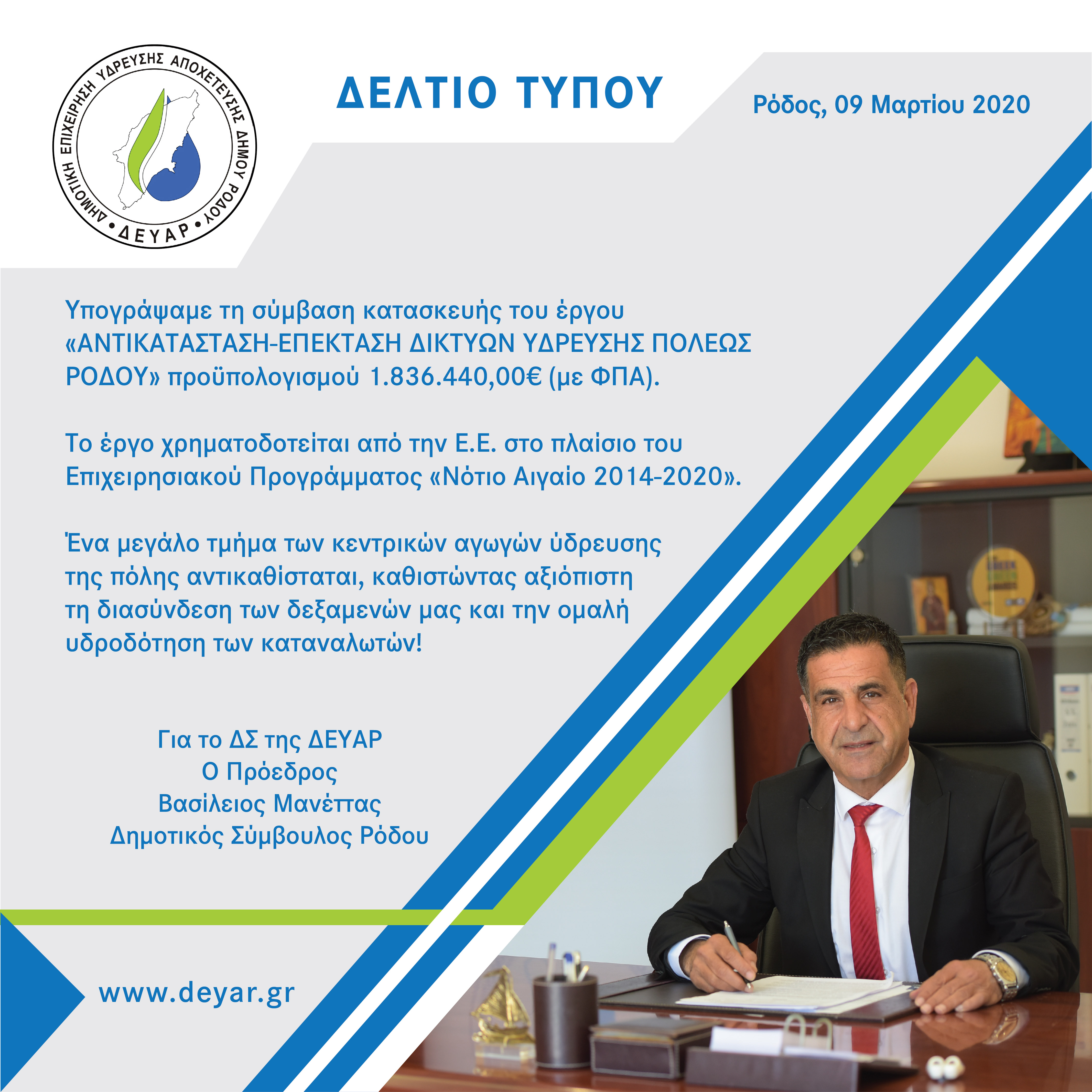 Υπογράψαμε τη σύμβαση κατασκευής του έργου «ΑΝΤΙΚΑΤΑΣΤΑΣΗ-ΕΠΕΚΤΑΣΗ ΔΙΚΤΥΩΝ ΥΔΡΕΥΣΗΣ ΠΟΛΕΩΣ ΡΟΔΟΥ» προϋπολογισμού 1.836.440,00€ (με ΦΠΑ).
