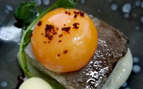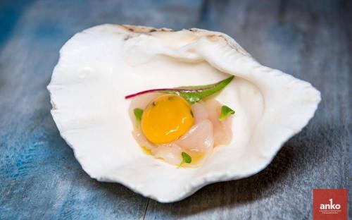 Με δύο μόνο, χρυσαφένια υλικά και ένα της βασικής, ευλογημένης διατροφής. Φούσκα της θάλασσας, αγνό λάδι και ψωμί, καθημερινό αγαθό στη διατροφή των Καλύμνιων. Φούσκα παιχνιδιάρικη, όλο κίνηση και νάζι. Που όταν της παραβιάσεις τη χαλαρή αίσθηση, ταμπουρώνεται στο πολύχρωμο κέλυφος, αποκτά την αντίσταση πολεμικού τείχους, και την αισθάνεσαι σαν απειλή. Σαν «δυναμίτης» στα χέρια σου… Εξίσου εκρηκτική και η γεύση στον ουρανίσκο.