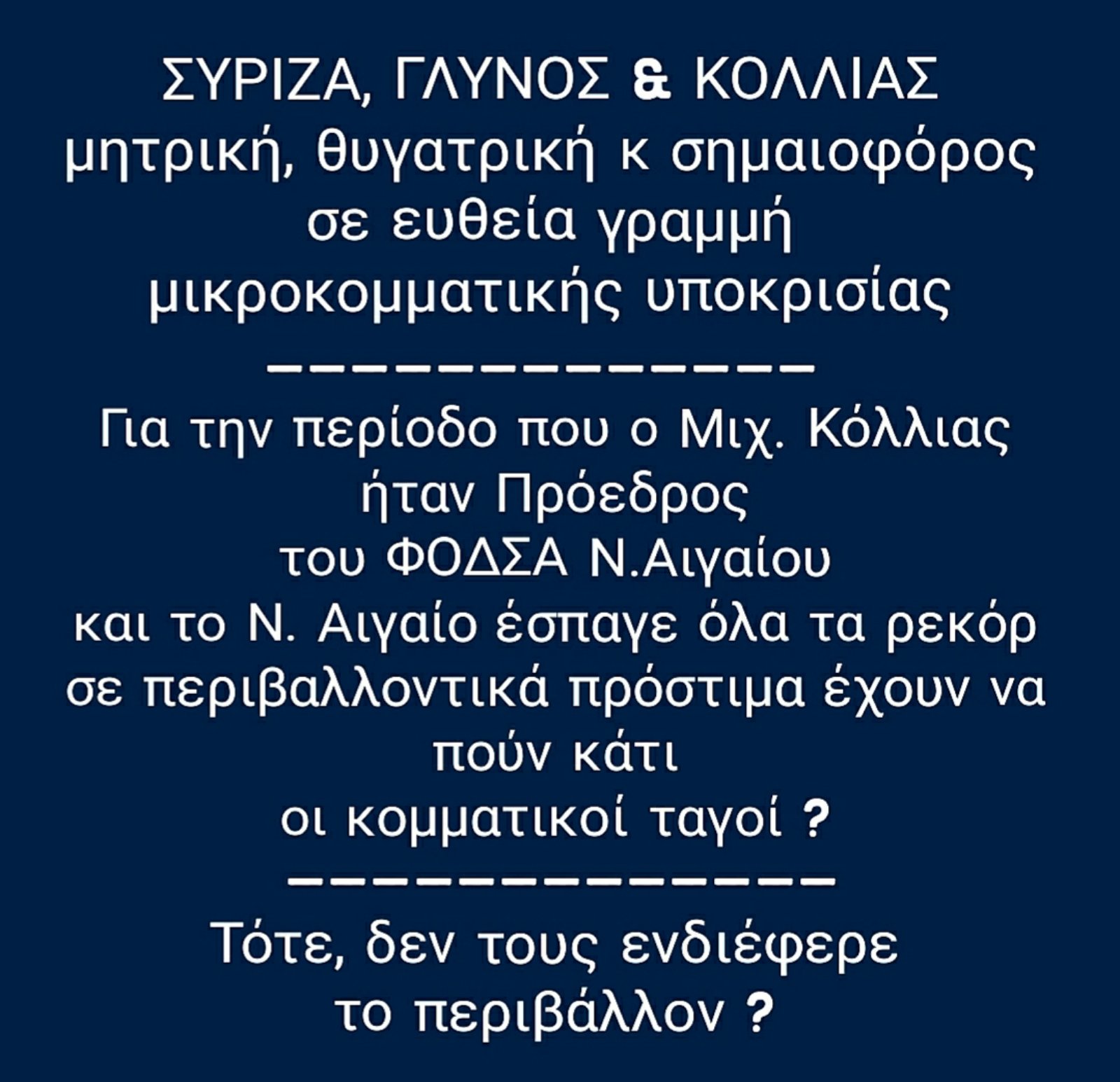 Όταν επί Προεδρίας Μιχ. Κόλλια το Ν. Αιγαίο έσπαγε όλα τα ρεκόρ σε πρόστιμα για το περιβάλλον πού ήταν αυτοί οι ευαίσθητοι πολίτες;