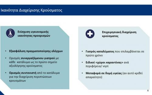 Ο πρώτος αφορά την ενίσχυση της υγειονομικής ικανότητας των περιοχών, και στο πλαίσιο αυτό θα ορίζεται συνεργαζόμενος γιατρός με κάθε κατάλυμα ως πρώτο σημείο αξιολόγηση των κρουσμάτων. Την ίδια στιγμή το κάθε κατάλυμα θα διαθέτει συντονιστή, προκειμένου η συνεργασία του γιατρού με τον συντονιστή να βοηθάει στο μέγιστο τη διαχείριση των τυχόν κρουσμάτων που θα προκύψουν και την επικοινωνία με την Πολιτική Προστασία.