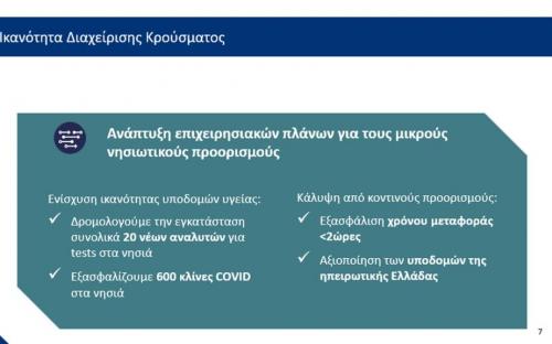 Για τους μικρούς νησιωτικούς προορισμούς -όπως τόνισε ο υπουργός- αναπτύχθηκαν ξεχωριστά επιχειρησιακά πλάνα για κάθε έναν από αυτούς, δρομολογώντας την τοποθέτηση 20 νέων αναλυτών για τεστ και εξασφαλίζοντας ταυτόχρονα 600 κλίνες Covid προκειμένου να καλύψουν κάθε πιθανή ανάγκη.