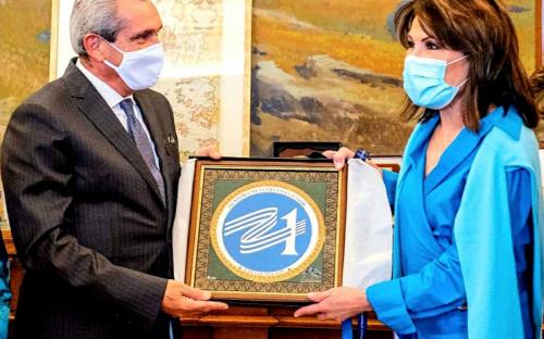 Με την ολοκλήρωση της συνάντησης, ο Περιφερειάρχης χάρισε στην κα Αγγελοπούλου ένα πλακίδιο ροδίτικης τεχνοτροπίας με το έμβλημα του επετειακού εορτασμού “Ελλάδα 2021”.