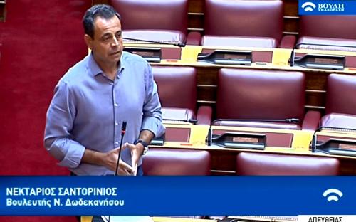 Όπως σημειώνει ο Νεκτάριος Σαντορινιός,αποτέλεσμα των αποσπασματικών πολιτικών της Κυβέρνησης, η πλειοψηφία των ξενοδοχειακών επιχειρήσεων της Δωδεκανήσου, οι οποίες είναι εποχικές, δεν μπορούν να ωφεληθούν από τα ευεργετήματα των εν λόγω διατάξεων, ενώ μένουν εκτός των μέτρων και χιλιάδες εποχικοί εργαζόμενοι. Μέσω της παρέμβασης του βουλευτή Δωδεκανήσου του ΣΥΡΙΖΑ- ΠΣ υπογραμμίζεται η άμεση ανάγκη για ρυθμίσεις που θα περιλαμβάνουν και τις εποχικές τουριστικές επιχειρήσεις.