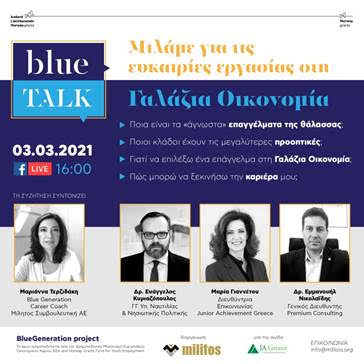 Το πρώτο blueTALK διοργανώνεται από την Μίλητος Συμβουλευτική Α.Ε., υπό την αιγίδα του Junior Achievement Greece, την Τετάρτη 03/03/2021 στις 16:00 σε ζωντανή αναμετάδοση στο Facebook στη σελίδα της ευρωπαϊκής πρωτοβουλίας BlueGenerationProjectGreece που στοχεύει να προσφέρει καθοδήγηση, σε +40.000 νέους, ηλικίας 15-29 ετών για τα «Επαγγέλματα της Θάλασσας», ώστε να σχεδιάσουν μια επιτυχημένη επαγγελματική σταδιοδρομία στη Γαλάζια Οικονομία.