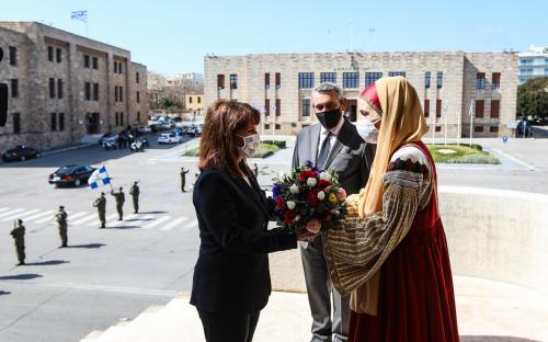 Η Πρόεδρος της Δημοκρατίας, που προηγουμένως ξεναγήθηκε από τον Περιφερειάρχη Γιώργο Χατζημάρκο και το Δήμαρχο Ρόδου Αντώνη Καμπουράκη σε αρχαιολογικής και ιστορικής αξίας περιοχές και ιδιαίτερα στη Μεσαιωνική Πόλη, δεν έκρυψε τη συγκίνησή της, ευρισκόμενη αυτή την ημερομηνία στα ακριτικά νησιά με την ένδοξη ιστορία αγώνων στο βάθος του χρόνου, που μετά από τόσους αιώνες υποδούλωσης, ενσωματώθηκαν με την ελεύθερη Ελλάδα.
