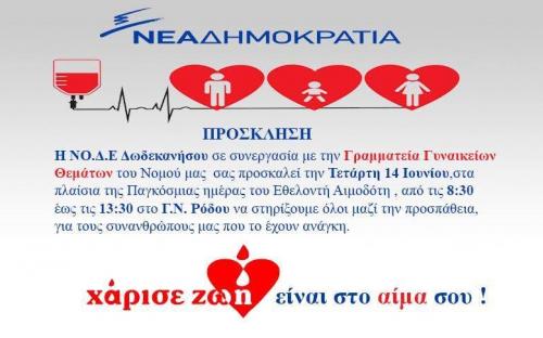 Η Περιφέρεια Νοτίου Αιγαίου σε συνεργασία με το «Όλοι μαζί μπορούμε» οργανώνει εθελοντική αιμοδοσία, την Τρίτη 23 Μαρτίου στη Ρόδο και την Τετάρτη 24 Μαρτίου στην Κω, εκτός Νοσοκομείων, σε ασφαλείς χώρους της Περιφέρειας, που τους παραχωρεί γι’ αυτό τον σκοπό, ώστε να καλυφθούν οι μεγάλες ανάγκες σε αίμα, που έχουν προκύψει. Στη Ρόδο ο χώρος που διαθέτει η Περιφέρεια είναι το κτήριο του παλαιού Προξενείου (Ιωάννου Καζούλη 8) και στην Κω το κτήριο του Επαρχείου Κω-Νισύρου (Ακτή Μιαούλη 2).