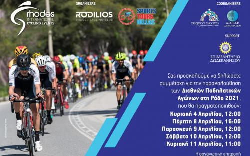 Η αντίστροφη μέτρηση, για τις μεγάλους διεθνείς ποδηλατικούς αγώνες 2021, έχει ξεκινήσει στη Ρόδο. Οι διοργανωτές πλέον μετρούν αντίστροφα για τα μεγάλα ποδηλατικά ραντεβού, που θα γίνουν στο νησί μας, στις 4, 8, 9, 10 και 11 Απριλίου. Η Rhodes International Cycling Events, o Ροδήλιος και η Sports Tours Hellas προετοιμάζονται πυρετωδώς για έναν άκρως… ποδηλατικό Απρίλιο, με διοργανώσεις που θα μείνουν χαραγμένες στη μνήμη των συμμετεχόντων. Συνδιοργανωτές είναι η Περιφέρεια Νοτίου Αιγαίου και ο Δήμος Ρόδου (Δ.Ο.Π.Α.Ρ.), με τη στήριξη του Επιμελητηρίου Δωδεκανήσου. Έτσι έχουν προγραμματιστεί να διεξαχθούν οι αγώνες, που κάθε χρόνο κεντρίζουν το ενδιαφέρον του κόσμου και φυσικά όσων συμμετέχουν.