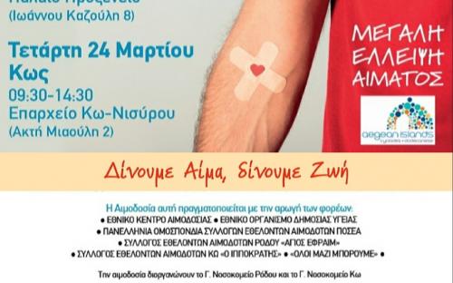 Αύριο, Τρίτη 23 Μαρτίου, οργανώνει η Περιφέρεια Νοτίου Αιγαίου εθελοντική αιμοδοσία, σε συνεργασία με το «Όλοι μαζί μπορούμε», σε χώρο ασφαλή, εκτός του Γ. Νοσοκομείου Ρόδου. Στόχος της πρωτοβουλίας είναι να καλυφθούν οι μεγάλες ανάγκες σε αίμα, που έχουν προκύψει και η ενίσχυση της τράπεζας αίματος.