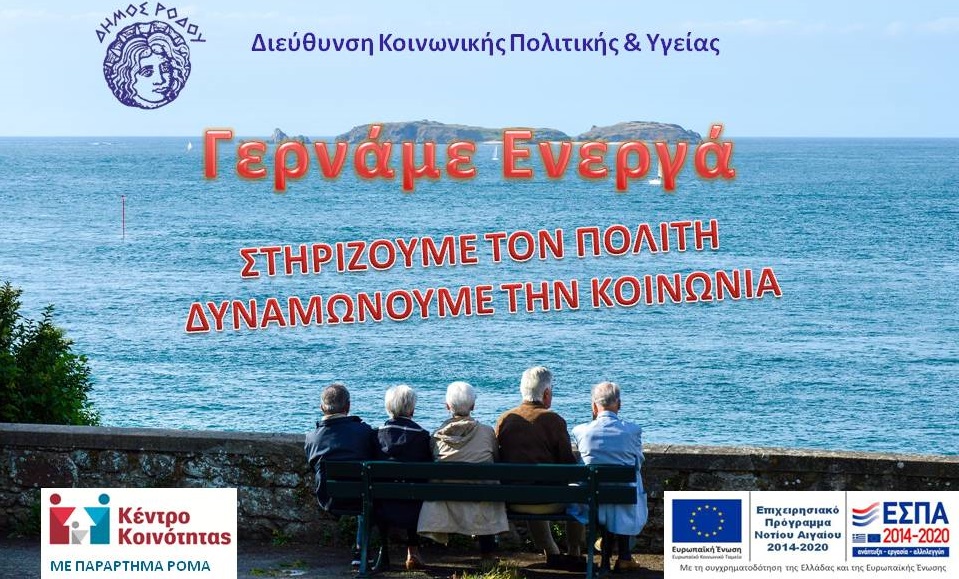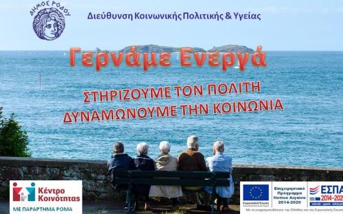 Το πρόγραμμα, που φέρει τον τίτλο «Γερνάμε Ενεργά», θα υλοποιηθεί από Ψυχολόγο και Κοινωνικό Λειτουργό του διευρυμένου Κέντρου Κοινότητας Δήμου Ρόδου με Παράρτημα Ρομά της Διεύθυνσης Κοινωνικής Πολιτικής και Υγείας, έχει σκοπό την πρόληψη των ψυχολογικών και κοινωνικών προβλημάτων των ηλικιωμένων, ώστε να παραμείνουν αυτόνομα, ισότιμα και ενεργά μέλη του κοινωνικού συνόλου.