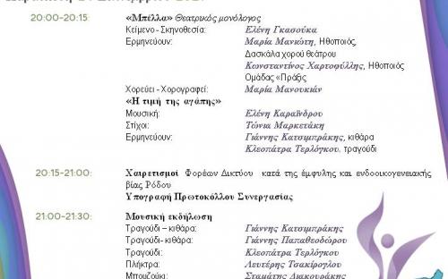 20:15-21:00: Χαιρετισμοί Φορέων Δικτύου κατά της έμφυλης και ενδοοικογενειακής βίας Ρόδου - Υπογραφή Πρωτοκόλλου Συνεργασίας