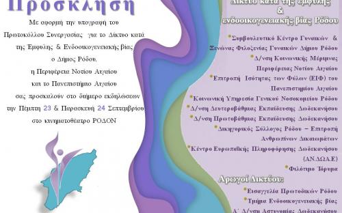 Με αφορμή την υπογραφή του Πρωτοκόλλου Συνεργασίας για το Δίκτυο κατά της Έμφυλης & Ενδοοικογενειακής βίας ο Δήμος Ρόδου, η Περιφέρεια Νοτίου Αιγαίου και το Πανεπιστήμιο Αιγαίου συνδιοργανώνουν διήμερο εκδηλώσεων την Πέμπτη 23 & Παρασκευή 24 Σεπτεμβρίου στο κινηματοθέατρο ΡΟΔΟΝ. Η υπογραφή του Πρωτοκόλλου Συνεργασίας θα γίνει τη Παρασκευή 24 Σεπτεμβρίου, δεύτερη μέρα των εκδηλώσεων. Αναλυτικότερα το πρόγραμμα έχει ως εξής: