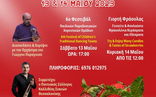 Το Φεστιβάλ θα ξεκινήσει το Σάββατο 13 Μαΐου, στις 5 η ώρα το απόγευμα, με το 6ο Φεστιβάλ Παιδικών Παραδοσιακών Χορευτικών Ομάδων και θα συνεχιστεί την Κυριακή 14 Μαΐου, οπότε, από τις 12 η ώρα το μεσημέρι, ντόπιοι και επισκέπτες θα έχουν τη χαρά να δοκιμάσουν κεράσματα και εδέσματα με βάση τη Φράουλα, να διασκεδάσουν και να χορέψουν με τη Ορχήστρα του Γιώργου Παραγυιού. Συμμετέχει ο Ποντιακός Σύλλογος Καλλιθέας Συκεών Θεσσαλονίκης με τον Θοδωρή Κοτίδη.