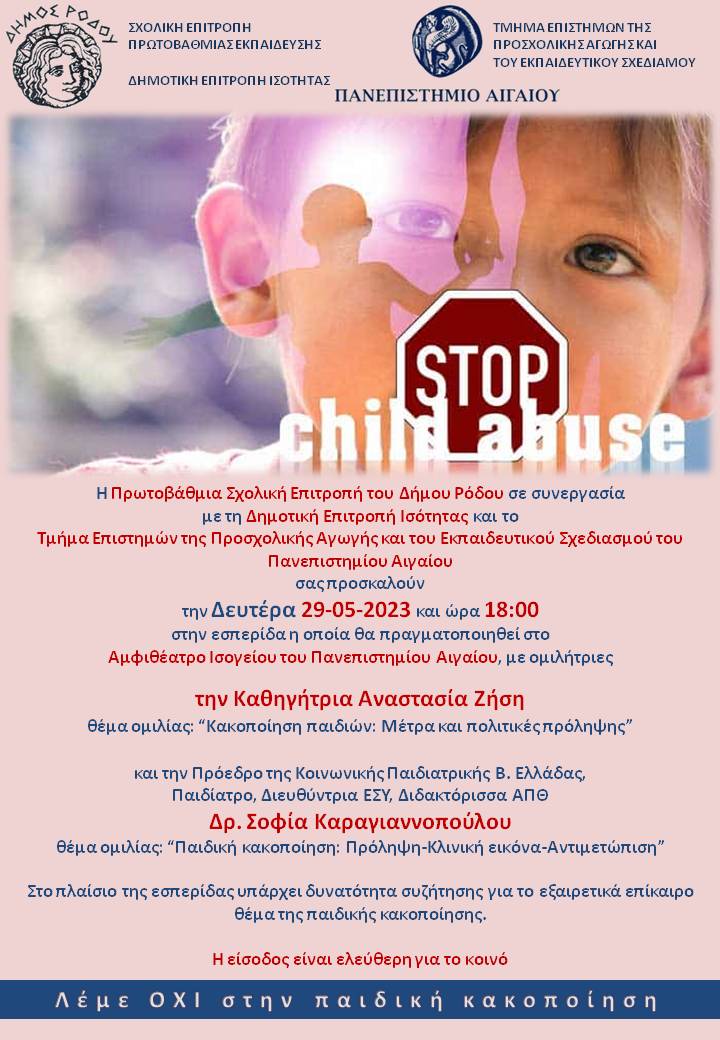 Στο πλαίσιο αυτό, με την αρωγή του Δημάρχου Ρόδου κ. Αντώνη Β. Καμπουράκη και τη συνεργασία του Πρόεδρου Πρωτοβάθμιας Σχολικής Επιτροπής του Δήμου Ρόδου και Προέδρου του ΤΕΠΑΕΣ Πανεπιστημίου Αιγαίου Καθηγητή Παναγιώτη Ι. Σταμάτη και της Εντεταλμένης Δημοτικής Συμβούλου για θέματα Ισότητας και Προέδρου της Δημοτικής Επιτροπής Ισότητας κα. Ευδοκίας Αποστολίδη – Πάττα διοργανώνεται εσπερίδα με τίτλο: «Λέμε ΟΧΙ στην παιδική κακοποίηση» τη Δευτέρα 29-05-2023 και ώρα 18:00 στο Αμφιθέατρο Ισογείου του Πανεπιστημίου Αιγαίου.