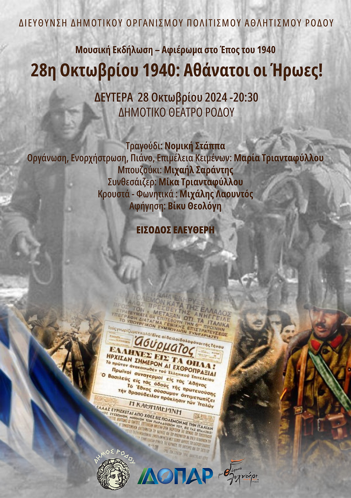 Την Δευτέρα 28/10/2024 και ώρα 20:30 στο Δημοτικό Θέατρο Ρόδου θα πραγματοποιηθεί συναυλία – αφιέρωμα στο Έπος του 1940. Με αφορμή τον δίσκο ΑΛΒΑΝΙΑ, σε στίχους Πυθαγόρα Παπασταματίου, μουσική Γιώργου Κατσαρού και την μοναδική ερμηνεία της Μαρινέλλας, η διεύθυνση ΔΟΠΑΡ του Δήμου Ρόδου σας προσκαλεί σε ένα μουσικό θέαμα αφιερωμένο στην επέτειο του «ΟΧΙ», μέσα από πλούσιο φωτογραφικό υλικό και αναγνώσεις γραμμάτων από το Μέτωπο.