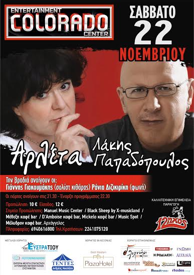 - Είναι συλλεκτικό είναι συγκινητικό είναι γεγονός …..η Αρλέτα συναντά το Λάκη Παπαδόπουλο στην μουσική σκηνή του Colorado το Σάββατο 22 Νοεμβρίου για μια μοναδική βραδιά γεμάτη εκπλήξεις.