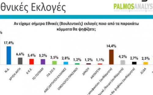 Με 10 μονάδες διαφορά προηγείται ο ΣΥΡΙΖΑ της ΝΔ στην πρόθεση ψήφου. Συγκεκριμένα το κόμμα της αξιωματικής αντιπολίτευσης συγκεντρώνει ποσοστό 27,4% έναντι 17,4% που λαμβάνει η ΝΔ. Στην τρίτη θέση με 14,4% όσοι απαντούν αυθόρμητα ότι δεν έχουν αποφασίσει ακόμη. Ακολουθούν Χρυσή Αυγή με 6,6%, ΚΚΕ με 5,4%, Ποτάμι με 5,2%, ΠΑΣΟΚ με 3,5%, ΑΝΕΛ με 2,8%, Οικολόγοι Πράσινοι και Δράση με 1,2% έκαστος και ΑΝΤΑΡΣΥΑ με 1,1%.